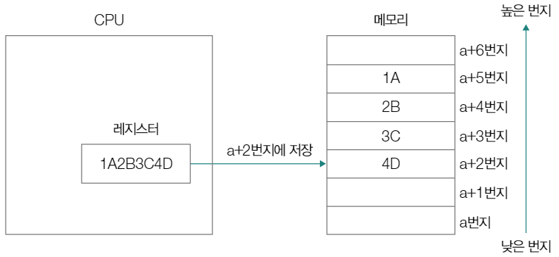 - Ex. 한 주소에 1바이트씩을 저장하는 메모리는 4바이트를 4개 주소에 걸쳐 저장