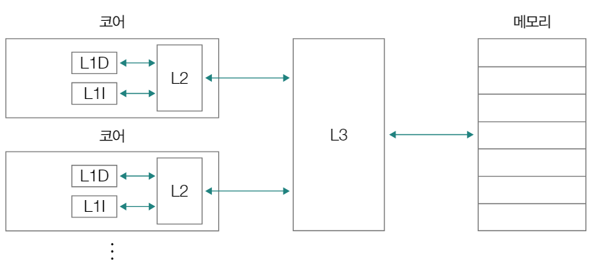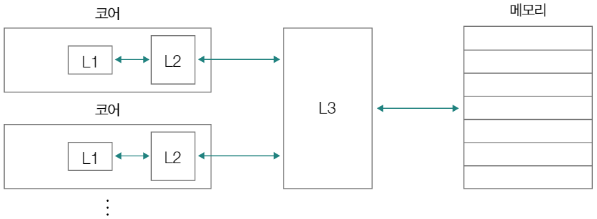 멀티코어 CPU에서는 각 코어가 독립적인 L1, L2 캐시를 가지며, L3 캐시는 코어들이 공유한다.